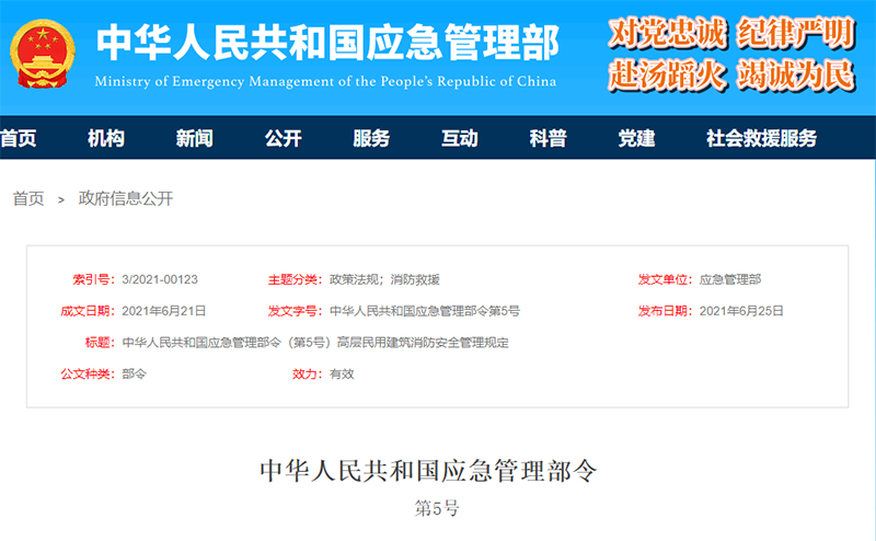 中華人民共和國應(yīng)急管理部令第5號《高層民用建筑消防安全管理規(guī)定》已經(jīng)2020年12月28日應(yīng)急管理部第39次部務(wù)會議審議通過,現(xiàn)予公布,自2021年8月1日起施行。部長 黃明2021年6月21日高層民用建筑消防安全管理規(guī)定第一章 總則第一條為了加強(qiáng)高層民用建筑消防安全管理,預(yù)防火災(zāi)和減少火災(zāi)危害,根據(jù)《中華人民共和國消防法》等法律、行政法規(guī)和國務(wù)院有關(guān)規(guī)定,制定本規(guī)定。第二條本規(guī)定適用于已經(jīng)建成且依法投入使用的高層民用建筑(包括高層住宅建筑和高層公共建筑)的消防安全管理。第三條高層民用建筑消防安全管理貫徹預(yù)防為主、防消結(jié)合的方針,實(shí)行消防安全責(zé)任制。建筑高度超過100米的高層民用建筑應(yīng)當(dāng)實(shí)行更加嚴(yán)格的消防安全管理。第二章 消防安全職責(zé)第四條高層民用建筑的業(yè)主、使用人是高層民用建筑消防安全責(zé)任主體,對高層民用建筑的消防安全負(fù)責(zé)。高層民用建筑的業(yè)主、使用人是單位的,其法定代表人或者主要負(fù)責(zé)人是本單位的消防安全責(zé)任人。高層民用建筑的業(yè)主、使用人可以委托物業(yè)服務(wù)企業(yè)或者消防技術(shù)服務(wù)機(jī)構(gòu)等專業(yè)服務(wù)單位(以下統(tǒng)稱消防服務(wù)單位)提供消防安全服務(wù),并應(yīng)當(dāng)在服務(wù)合同中約定消防安全服務(wù)的具體內(nèi)容。第五條同一高層民用建筑有兩個(gè)及以上業(yè)主、使用人的,各業(yè)主、使用人對其專有部分的消防安全負(fù)責(zé),對共有部分的消防安全共同負(fù)責(zé)。同一高層民用建筑有兩個(gè)及以上業(yè)主、使用人的,應(yīng)當(dāng)共同委托物業(yè)服務(wù)企業(yè),或者明確一個(gè)業(yè)主、使用人作為統(tǒng)一管理人,對共有部分的消防安全實(shí)行統(tǒng)一管理,協(xié)調(diào)、指導(dǎo)業(yè)主、使用人共同做好整棟建筑的消防安全工作,并通過書面形式約定各方消防安全責(zé)任。第六條高層民用建筑以承包、租賃或者委托經(jīng)營、管理等形式交由承包人、承租人、經(jīng)營管理人使用的,當(dāng)事人在訂立承包、租賃、委托管理等合同時(shí),應(yīng)當(dāng)明確各方消防安全責(zé)任。委托方、出租方依照法律規(guī)定,可以對承包方、承租方、受托方的消防安全工作統(tǒng)一協(xié)調(diào)、管理。實(shí)行承包、租賃或者委托經(jīng)營、管理時(shí),業(yè)主應(yīng)當(dāng)提供符合消防安全要求的建筑物,督促使用人加強(qiáng)消防安全管理。第七條高層公共建筑的業(yè)主單位、使用單位應(yīng)當(dāng)履行下列消防安全職責(zé):(一)遵守消防法律法規(guī),建立和落實(shí)消防安全管理制度;(二)明確消防安全管理機(jī)構(gòu)或者消防安全管理人員;(三)組織開展防火巡查、檢查,及時(shí)消除火災(zāi)隱患;(四)確保疏散通道、安全出口、消防車通道暢通;(五)對建筑消防設(shè)施、器材定期進(jìn)行檢驗(yàn)、維修,確保完好有效;(六)組織消防宣傳教育培訓(xùn),制定滅火和應(yīng)急疏散預(yù)案,定期組織消防演練;(七)按照規(guī)定建立專職消防隊(duì)、志愿消防隊(duì)(微型消防站)等消防組織;(八)法律、法規(guī)規(guī)定的其他消防安全職責(zé)。委托物業(yè)服務(wù)企業(yè),或者明確統(tǒng)一管理人實(shí)施消防安全管理的,物業(yè)服務(wù)企業(yè)或者統(tǒng)一管理人應(yīng)當(dāng)按照約定履行前款規(guī)定的消防安全職責(zé),業(yè)主單位、使用單位應(yīng)當(dāng)督促并配合物業(yè)服務(wù)企業(yè)或者統(tǒng)一管理人做好消防安全工作。第八條高層公共建筑的業(yè)主、使用人、物業(yè)服務(wù)企業(yè)或者統(tǒng)一管理人應(yīng)當(dāng)明確專人擔(dān)任消防安全管理人,負(fù)責(zé)整棟建筑的消防安全管理工作,并在建筑顯著位置公示其姓名、聯(lián)系方式和消防安全管理職責(zé)。高層公共建筑的消防安全管理人應(yīng)當(dāng)履行下列消防安全管理職責(zé):(一)擬訂年度消防工作計(jì)劃,組織實(shí)施日常消防安全管理工作;(二)組織開展防火檢查、巡查和火災(zāi)隱患整改工作;(三)組織實(shí)施對建筑共用消防設(shè)施設(shè)備的維護(hù)保養(yǎng);(四)管理專職消防隊(duì)、志愿消防隊(duì)(微型消防站)等消防組織;(五)組織開展消防安全的宣傳教育和培訓(xùn);(六)組織編制滅火和應(yīng)急疏散綜合預(yù)案并開展演練。高層公共建筑的消防安全管理人應(yīng)當(dāng)具備與其職責(zé)相適應(yīng)的消防安全知識和管理能力。對建筑高度超過100米的高層公共建筑,鼓勵有關(guān)單位聘用相應(yīng)級別的注冊消防工程師或者相關(guān)工程類中級及以上專業(yè)技術(shù)職務(wù)的人員擔(dān)任消防安全管理人。第九條高層住宅建筑的業(yè)主、使用人應(yīng)當(dāng)履行下列消防安全義務(wù):(一)遵守住宅小區(qū)防火安全公約和管理規(guī)約約定的消防安全事項(xiàng);(二)按照不動產(chǎn)權(quán)屬證書載明的用途使用建筑;(三)配合消防服務(wù)單位做好消防安全工作;(四)按照法律規(guī)定承擔(dān)消防服務(wù)費(fèi)用以及建筑消防設(shè)施維修、更新和改造的相關