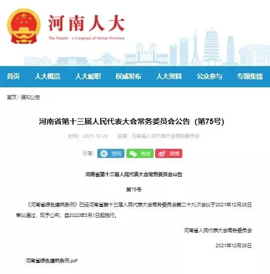 河南省十三屆人大常委會第二十九次會議于2021年12月28日在鄭州閉幕,會議表決通過的《河南省綠色建筑條例》(以下簡稱“條例”),在全國綠色建筑發展進程中可謂立法先行,創新引領。