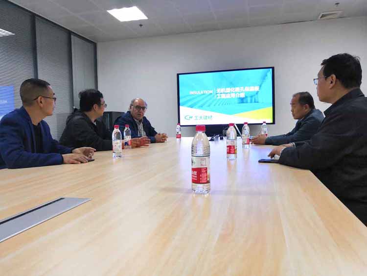 約旦ACC公司采用美國陶氏公司技術(shù)生產(chǎn)有機類保溫材料,產(chǎn)品廣泛應用于中東建筑市場,但因達不到A級燃燒等級,近期在沙特的建筑工地二次引發(fā)了火災。 為了盡快找到替代產(chǎn)品與生產(chǎn)技術(shù), ACC公司制造主管HANI ABU KHALAF先生到公司進行了商務與技術(shù)交流,公司總經(jīng)理趙振波先生與技術(shù)團隊參加了交流。客商對公司研發(fā)的無機塑化微孔保溫板項目表示了極大的合作興趣。