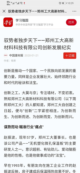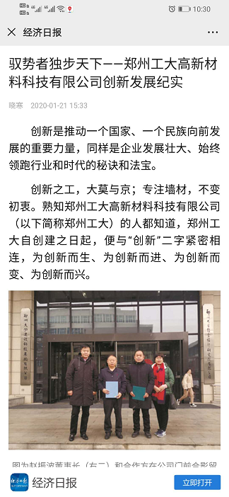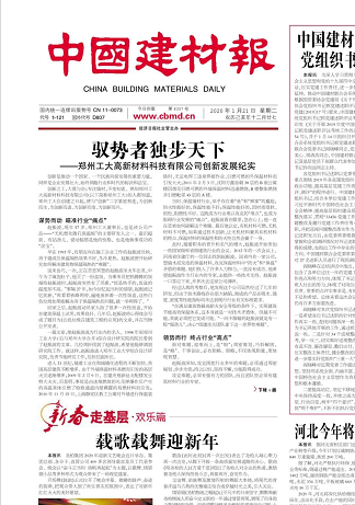 2020年1月21日,《中國建材報》在頭版頭條位置,刊發了本公司長篇紀實通訊《馭勢者獨步天下——鄭州工大高新材料科技有限公司創新發展紀實》,文中對公司發展歷程進行記述的同時,對公司產品“無機塑化微孔保溫板”給予了高度評價,文章說:“無機塑化微孔保溫板”不僅占領了保溫墻材行業的“高點”,也徹底解決了國內節能建筑防火與保溫不能兼容的行業窘迫局面。隨后,學習強國、經濟日報公眾號全文轉發。文章全文如下: